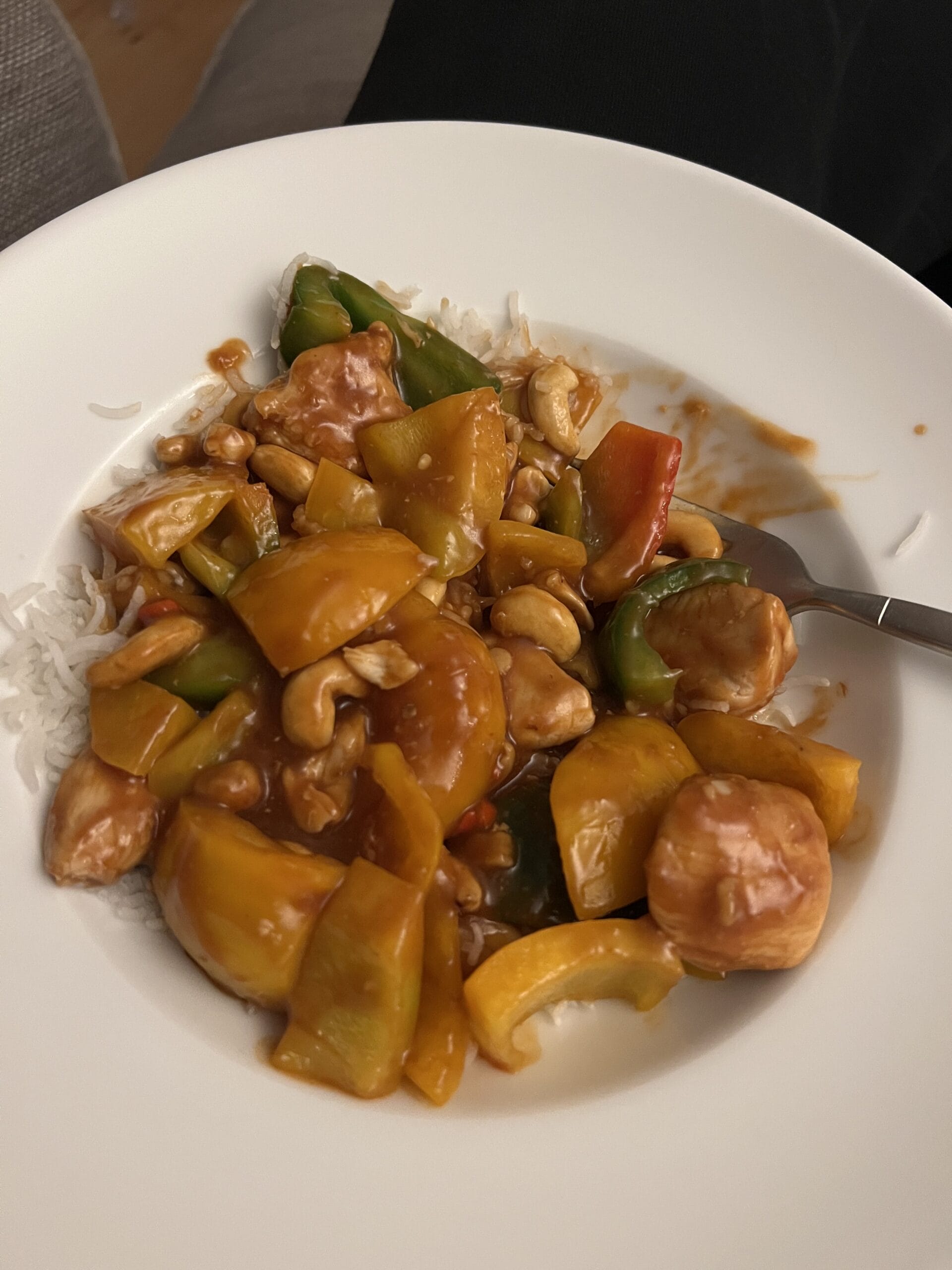 Pour the sauce into the wok and the nuts if using, stir everything and simmer for a few minutes until the chicken is cooked. Serve with rice.