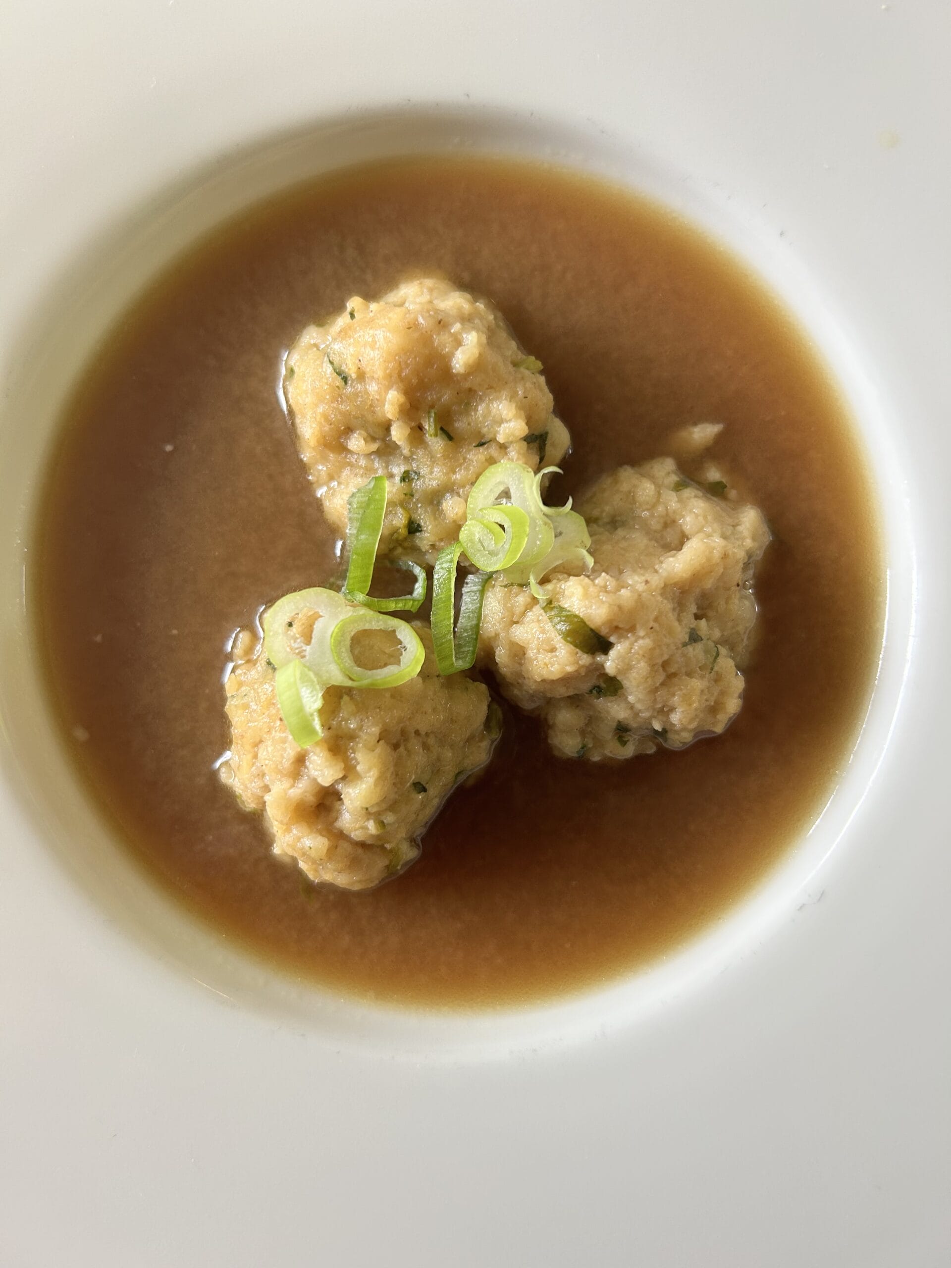 When you’re ready to cook the ball, bring the broth to a simmer, carefully slide in the balls, cover the pan with a lid and cook on a very low light for 30 minutes with no peaking. After 30 mins remove a ball to test if its cooked all the way through. It should light and fluffy and not dense in the middle. If they aren’t cooked continue for another 10 minutes.