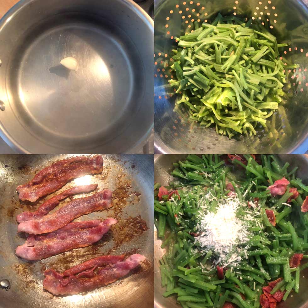 - In a frying pan that will be large enough to add the beans when cooked, drizzle a little oil and cook the pancetta until brown and crisp. Move the pan to the back of the stove until awaiting the beans.