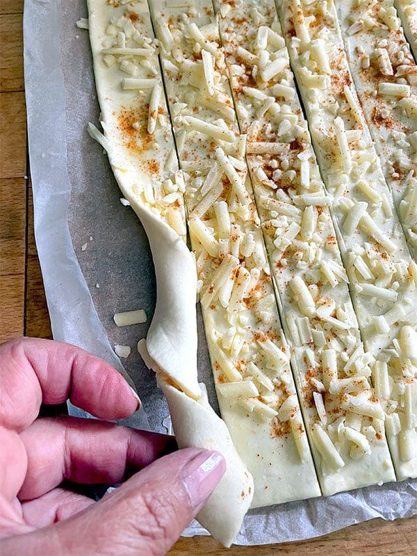 - Slice the pastry into 12-14 slices. Twist each slice