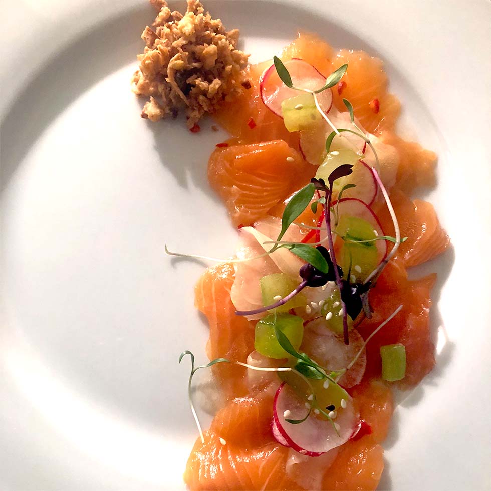 Curing the salmon with chilli gives it a lovely background heat which is then complimented with lightly pickled ingredients and the sweetness of elderflower gel. In the photo, I served mine with a little pinch of friend shallots for a bit of crunch