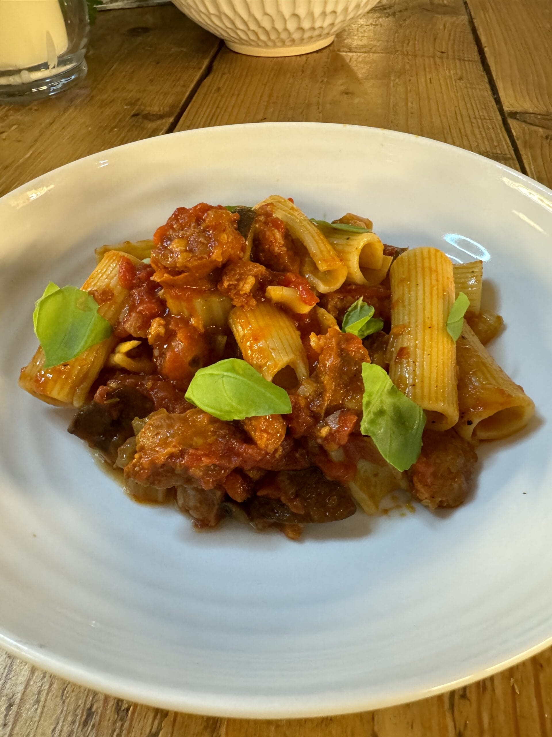 Tasty week night pasta dish. Don’t have to follow the recipe slavishly, swap the chorizo with a basic sausage, add whatever vegetables you have if you don’t like/have mushrooms.