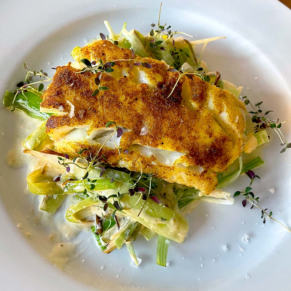Add the olive oil to a large frying pan, when hot add the cod and cook for 3 minutes. Turn the cod over and cook for another 3 minutes. Tuck the leeks all around the pan, top with pieces of the butter. Check that the fish is cooked – it should be flakey in the middle and remove to a warm plate while you finish the leeks.