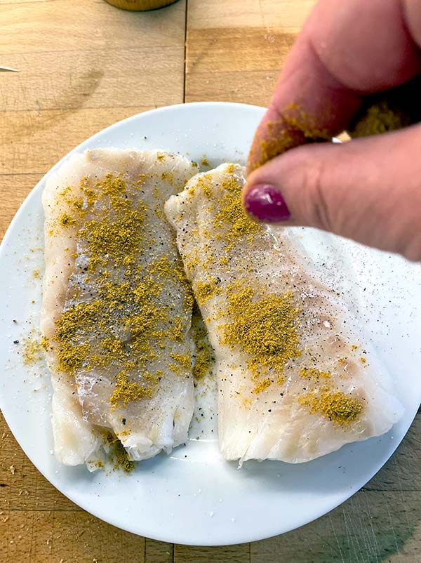 - Season the fish with salt and pepper on both sides then sprinkle each piece with curry powder on top and bottom.