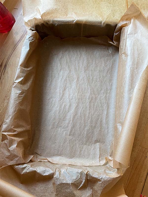 Preheat the oven to 160C fan. Lie 2 pieces of string in a cross in the tin then top with 2 pieces of baking paper in a cross (see photos).