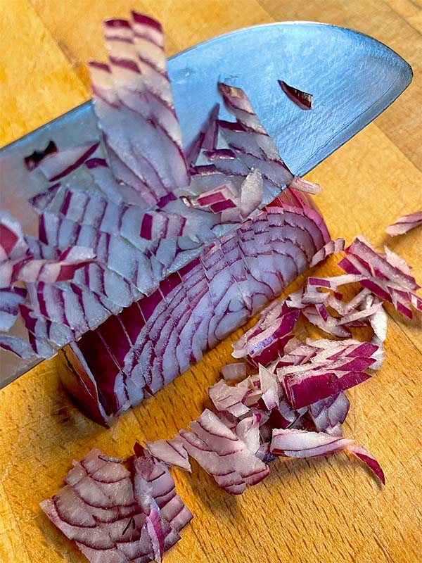 - Cut the red onion in half. Finely dice one half and cut the other half into very thin slices. Put the slices in a bowl add the lime and toss to coat. Leave to macerate for at least 30 minutes before serving.