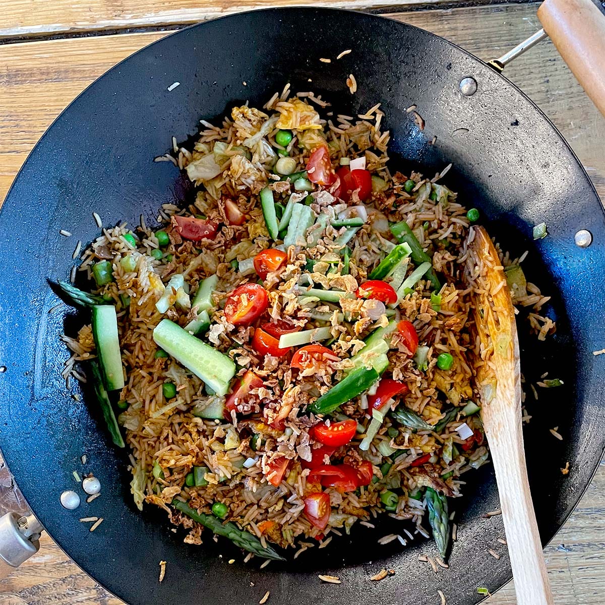 - Using your hand, break up any lumps in the rice and add to the wok along with the cooked vegetables. Stir in soy sauce and kecap manis, stir to ensure everything is heated through. Serve sprinkled with chilli, spring onions and a drizzle of sesame oil.