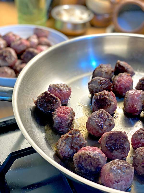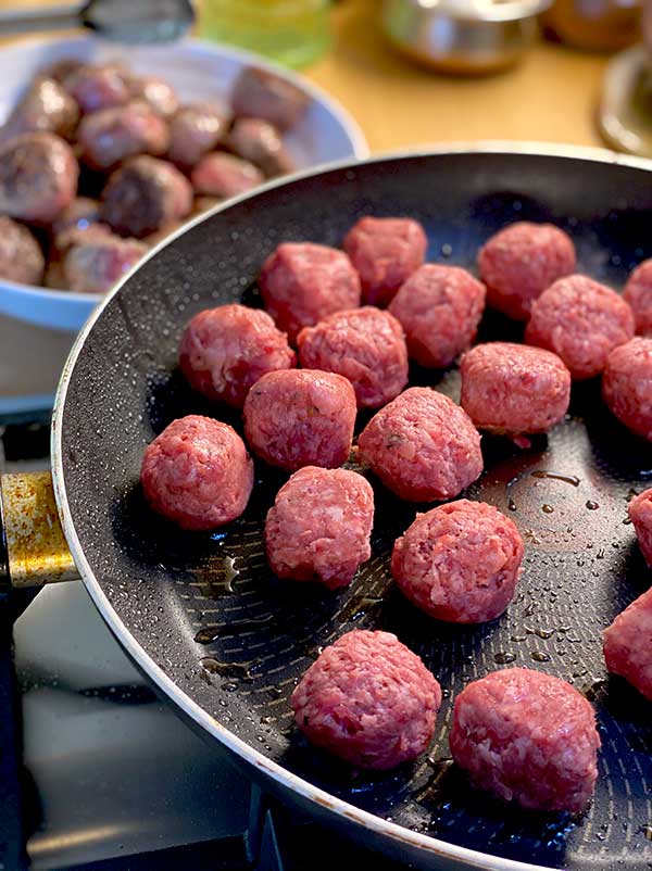 - Heat a frying pan with 1 tbsp of the olive oil and brown the meatballs all over on a high heat. You want a nice dark colour and it doesn’t matter if bits stick to the bottom of the pan as you will deglaze the pan later.