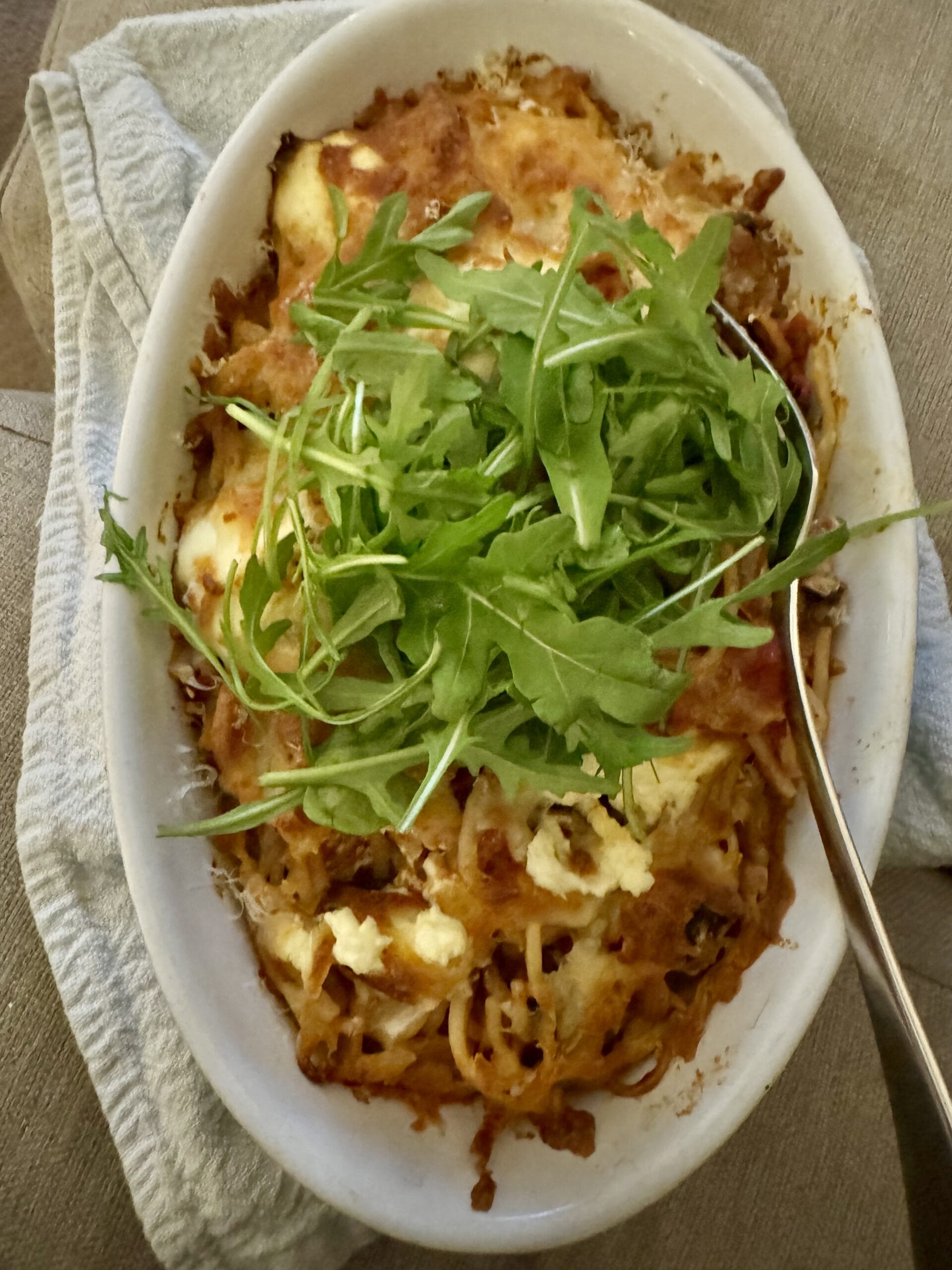 Add dollops of ricotta, followed by mozzarella and finishing with parmesan. Bake for 20 minutes or until brown and bubbling. I like mine piled with rocket on the top.