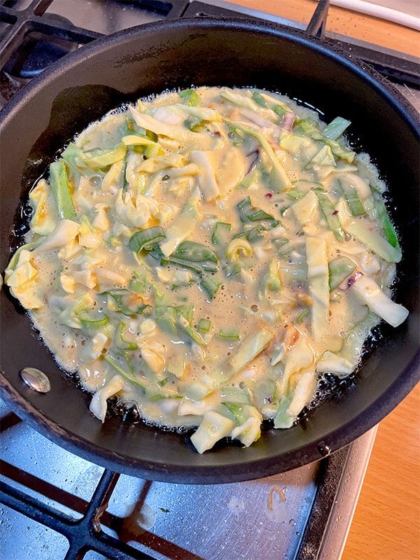 - In a small non stick frying pan, heat the vegetable oil. Add 1/2 the mixture. Lower the heat to medium and cook for 3-4 minutes.