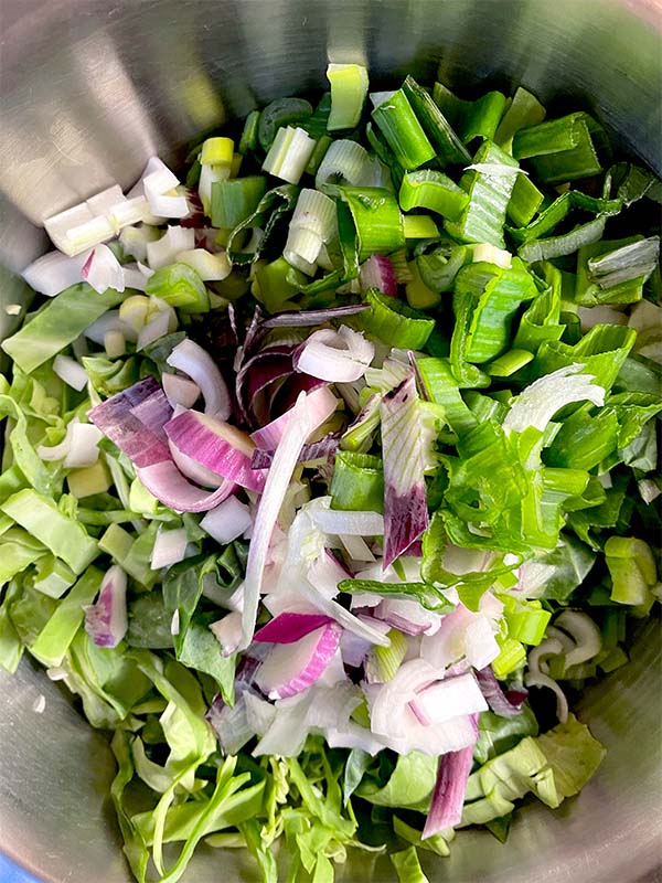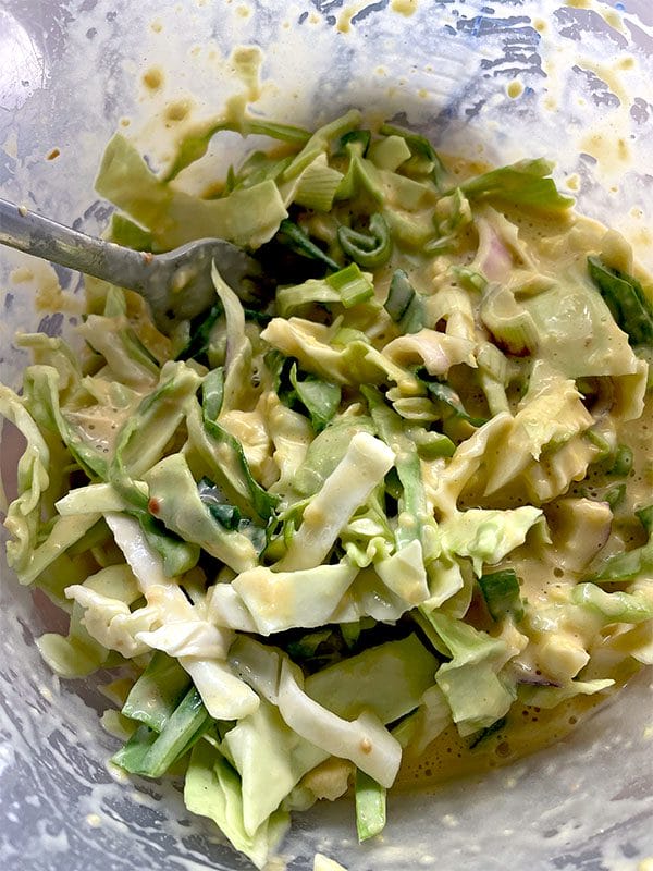 - Add the cabbage and most of the spring onions, reserving a few slices for garnish and stir to combine. Set aside to rest for 15 minutes.
