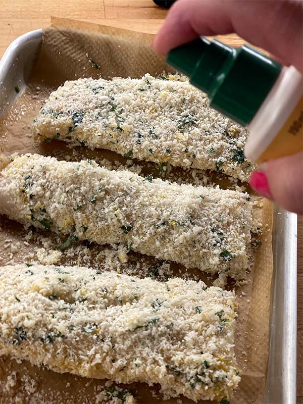 - Take the first fillet and coat in flour, then coat in the egg and finally, generously coat with breadcrumb mix. Spray on both sides with an oil spray and place on the other baking tray. Repeat with the remaining fillets.