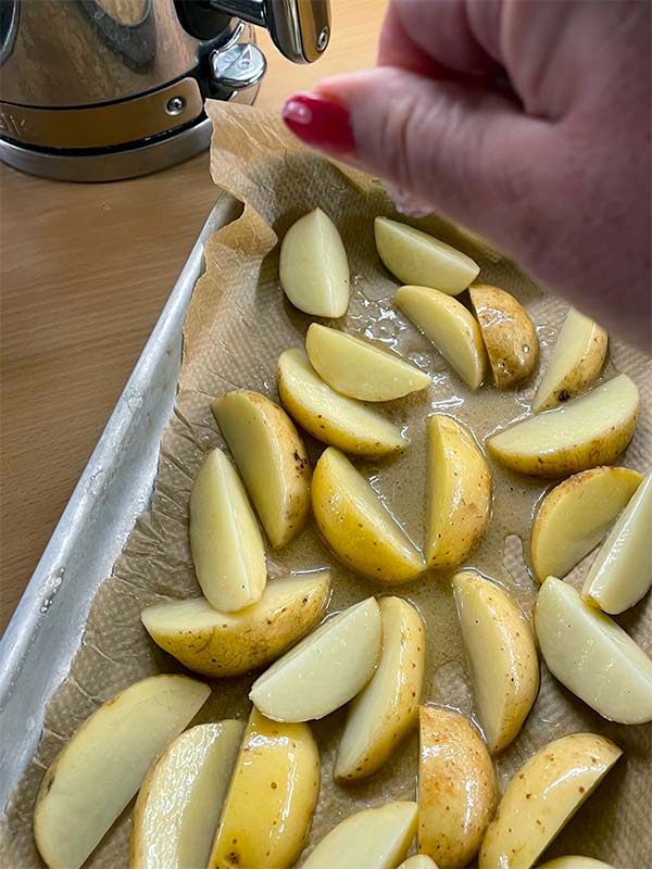 - Cut the potatoes into wedges, no need to peel put on one of the baking trays, toss with olive oil and a good sprinkling of salt and roast on the top shelf for 15 minutes.