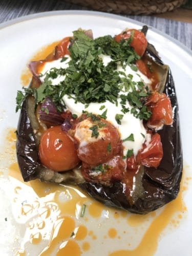 - Remove the baking tray from the oven. First remove the garlic cloves, squeeze the garlic paste onto a plate and mash then stir into the greek yoghurt. Place an aubergine on 4 warmed plates. Split the aubergine open from top to bottom, loosen some of the flesh and season well with salt. Top each with tomatoes and onions, spoon over the harissa butter mix, add pine nuts if using, Finish with the yoghurt and sprinkle with herbs.