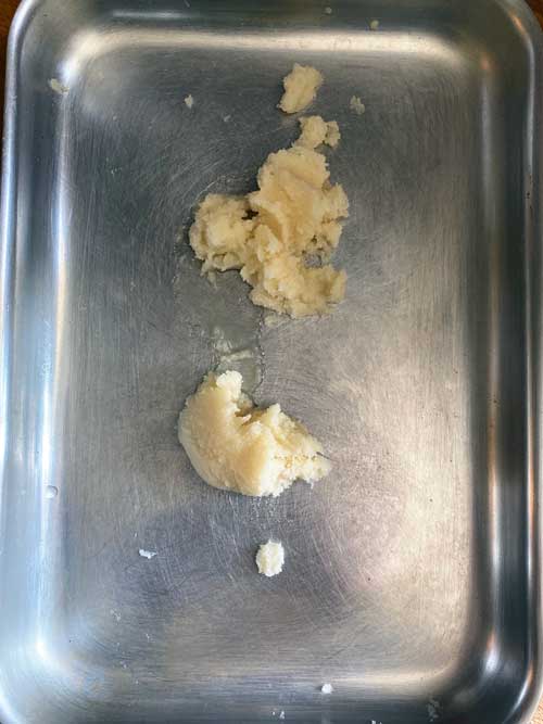 Using the lid to stop the potatoes tumbling out of the pan, drain the water and once it’s all gone, Use a tea towel to hold the lid in place so you don’t burn your hands, give the pan a really good shake. You want to rough up the outside of the potatoes. Remove the lid, tip the potatoes into a colander and ideally leave for at least 10 minutes to release the steam. At this stage, you can keep them for up to a day which is ideal when cooking a big Christmas meal.