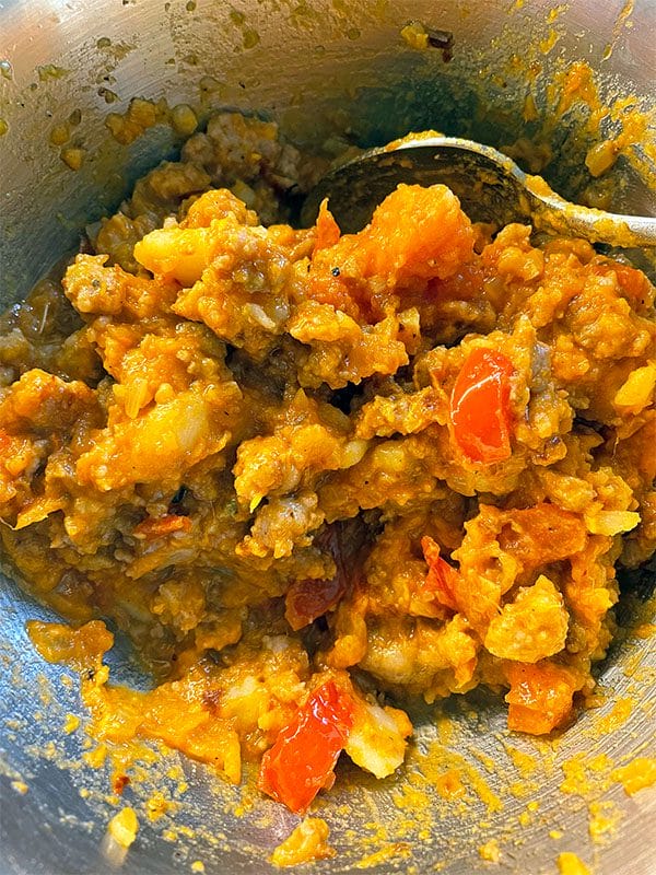 - Remove the skins from the sausages. Add a splash of vegetable oil to a frying pan and crumble in the sausages. Cook for 5-10 minutes until starting to brown. Add the onion and cook for 5 minutes until soft. Add the garlic and cook for 1 minutes then add cumin, chilli and tomatoes along with good few pinches to salt. Cook for a couple more minutes.