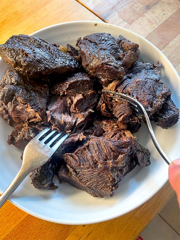 You can braise the cheeks in a pan or in one third of the time if you use a pressure cooker. Shredding the beef makes it go further so this quantity will feed 6 people.