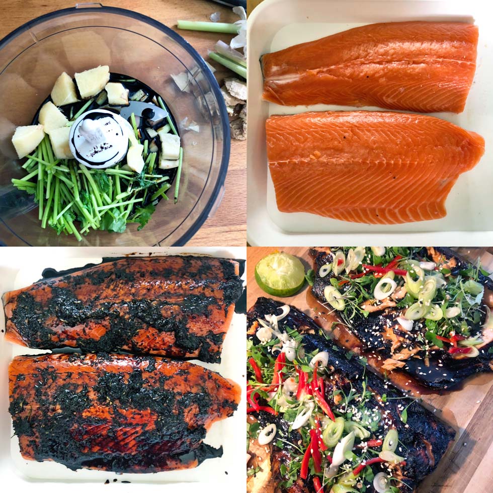 - First make the marinade. Put lemongrass, soy, coriander stalks, ginger and garlic in a small food processor and blitz to a paste. Pour the marinade over the top of the salmon, cover and put in the fridge for at least a couple of hours or overnight.