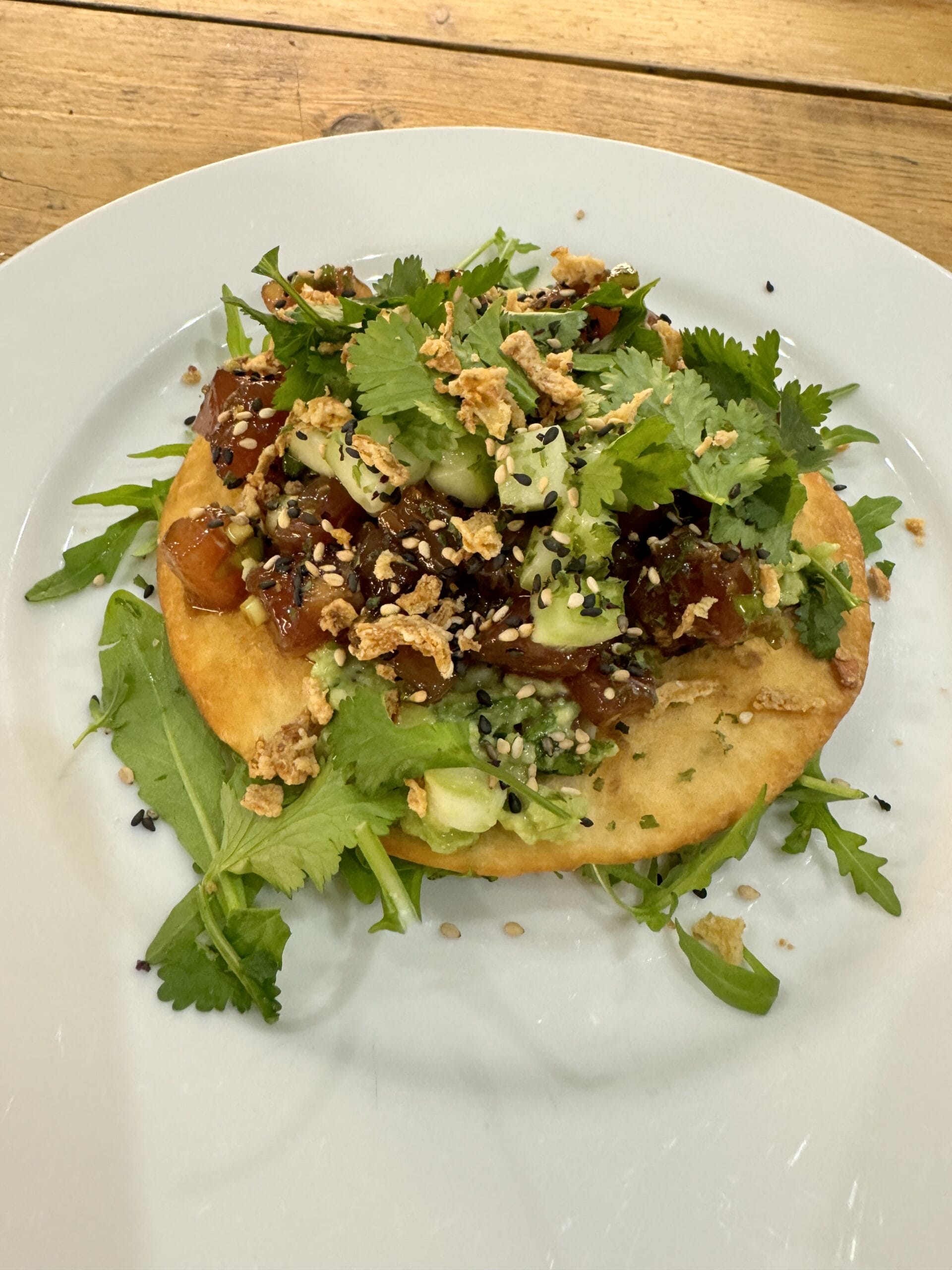 - Place some rocket leaves on the plate, drizzle with a little of the tuna marinade. Place the tortilla, smother with guacamole, divide the tuna on top of the guacamole, sprinkle with cucumber and finish with furikake or sesame seeds, coriander leaves and friend onions if using