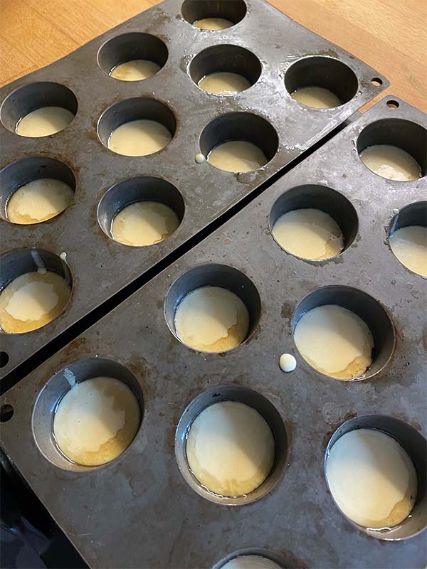 - Put the greased muffin mould on a baking sheet and place in the oven for 5 minutes. It should be smoking hot before the batter is added. Add 1 tbsp of batter to each hole and put in the oven for 8-10 minutes until well risen and golden. Repeat the process until all the batter is used making sure you reheat the moulds each time before adding the batter. The secret to a good rise is a hot mould.